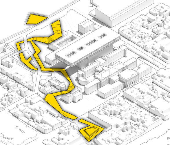 2. Opening, connection and unification at city level, through a public linear park and a system of places.